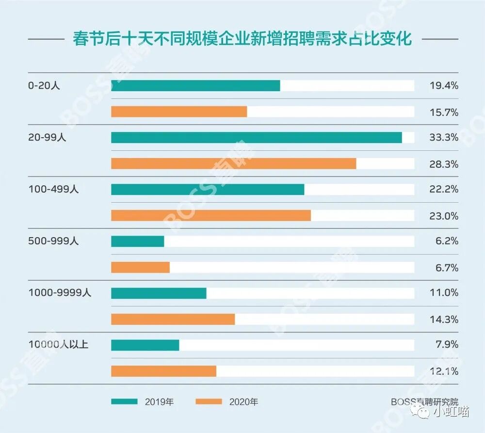赤裸裸的数据更为残酷。BOSS直聘发布的《2020年春节后10天人才趋势观察》中的数据显示——应届生新增岗位规模同比降幅49%,作为应届生岗位的创造主体的小微企业(100人以下)应届生需求同比降幅达到60%。